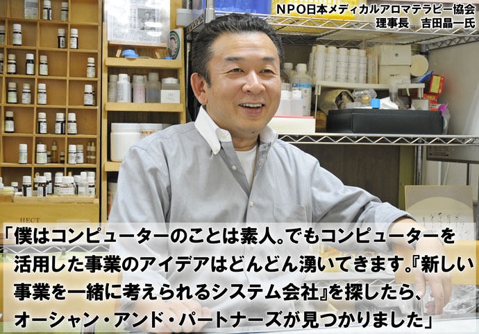 NPO法人日本メディカルアロマテラピー協会では、IT技術を活用した事業開発のコンサルティングと事業の核になるシステムの開発を、オーシャン・アンド・パート ナーズに依頼しています。理事長の吉田晶一氏に、オーシャン・アンド・パートナーズを選んだ理由や、オーシャン・アンド・パートナーズへの評価をうかがいました。