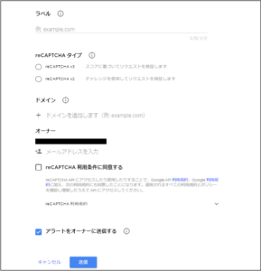 ラベル reCAPTCHAの管理画面で使用される名称になります。わかりやすいお好みの名称を入力します。