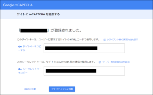 入力できたら[送信]ボタンを押すとサイトキーとシークレットキーの取得は完了です。