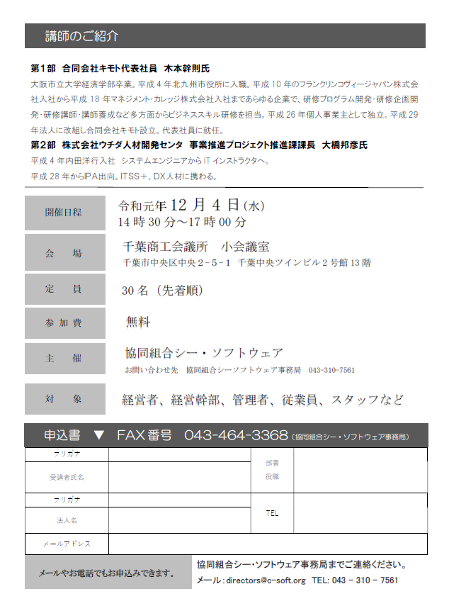 弊社代表(谷尾薫)が代表理事を務める協同組合シー・ソフトウェアにて以下のセミナーを開催します。