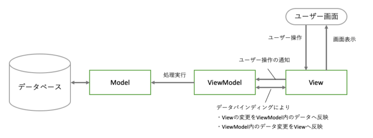 データバインディングという機能によりViewと保持データを結びつけ、両者の変更を互いに反映することで常にViwModelがViewと同じデータを保持すると言う考え方です。