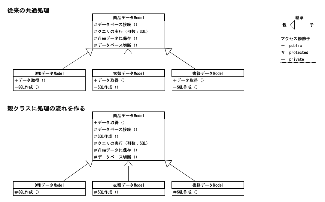 従来の共通処理のイメージでも「親クラスに処理の流れを作る」のイメージでも「DVDデータModel」をコピーし、「SQL作成」メソッドを書き換えることになるでしょう。