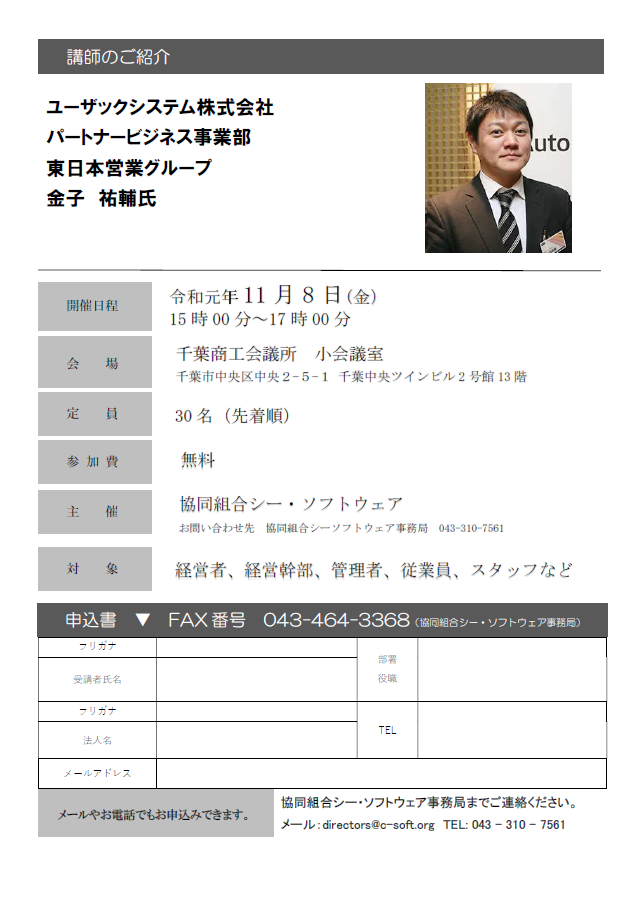 弊社代表(谷尾薫)が代表理事を務める協同組合シー・ソフトウェアにて以下のセミナーを開催します。