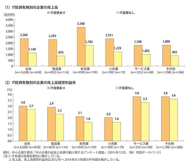 なおIT投資比率の高い企業は本当に成果を上げているかどうかの調査結果があり、以下のグラフは、IT投資有無別の企業の経常利益の違いを示しています。