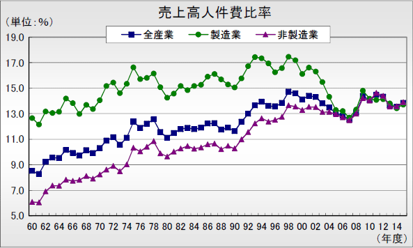 このデータによれば売上高に占める人件費率は14%です。